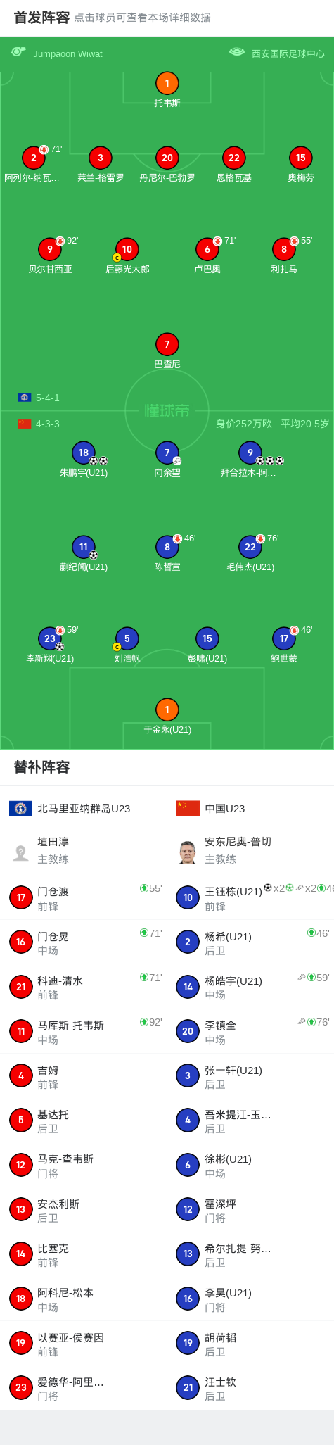 北京时间9月6日U23亚洲杯预选赛第2轮,中国U23对阵北马里亚纳群岛U23。上半场,拜合拉木补时破门,U23国足1-0领先。下半场,王钰栋替补出场贡献3球2助攻,拜合拉木完成帽子戏法,朱鹏宇梅开二度,李新翔、蒯纪闻分别破门。最终比分U23国足10-0大胜北马里亚纳群岛U23。